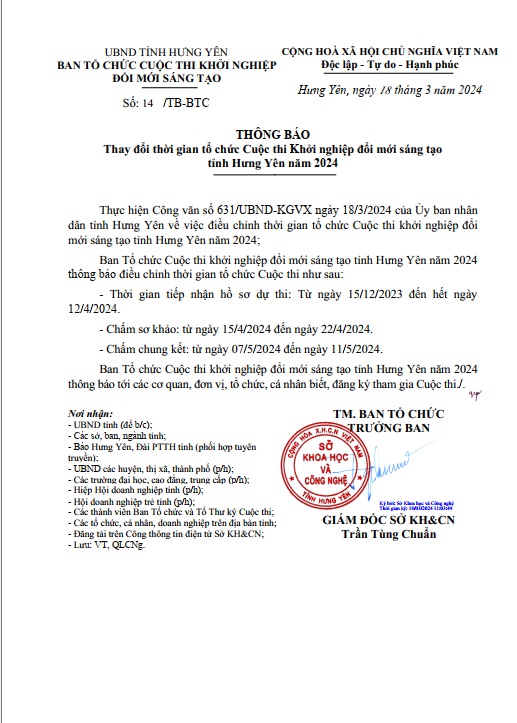 Ngày 18/3/2024, Ban Tổ chức Cuộc thi khởi nghiệp đổi mới sáng tạo tỉnh Hưng Yên năm 2024 ban hành Thông báo thay đổi thời gian tổ chức Cuộc thi Khởi nghiệp đổi mới sáng tạo tỉnh Hưng Yên năm 2024