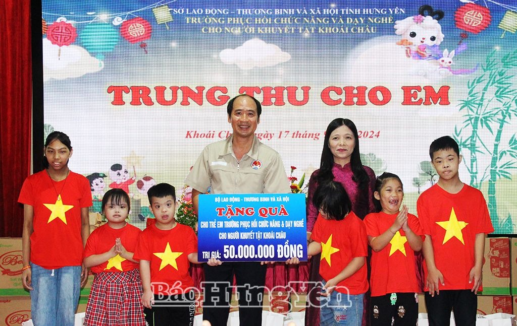 Cùng ngày, đồng chí Nguyễn Văn Hồi và đoàn công tác đến thăm, trao 50 triệu đồng và quà của Quỹ Bảo trợ trẻ em Việt Nam tặng trẻ em đang học tập tại Trường Phục hồi chức năng và dạy nghề cho người khuyết tật Khoái Châu.