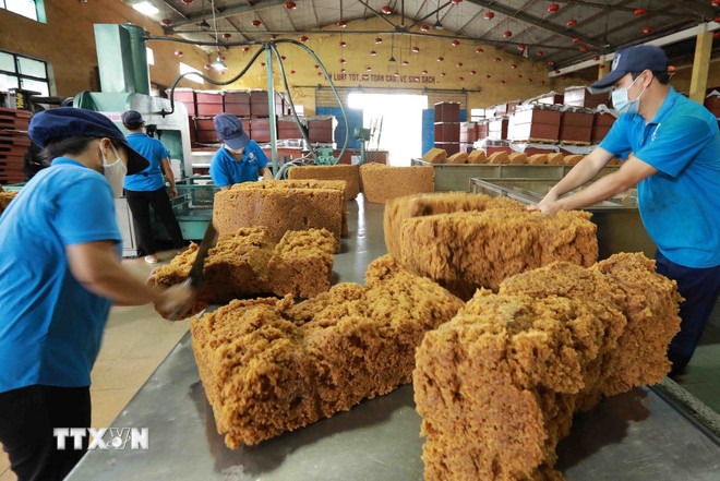 Sản xuất mủ cao su xuất khẩu ở nhà máy của Tập đoàn Công nghiệp Cao su Việt Nam. (Ảnh: Vũ Sinh/TTXVN)