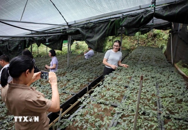 Du khách được trải nghiệm tham quan vườn Sâm, một loại dược liệu quý hiếm được bảo tồn và nhân giống thành công tại tỉnh Lai Châu. (Ảnh: Quý Trung/TTXVN)
