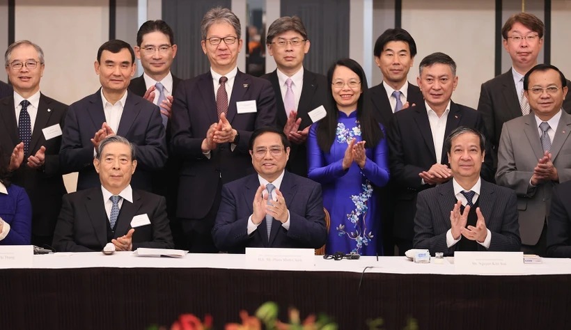 Thủ tướng Phạm Minh Chính với một số doanh nghiệp Nhật Bản về vi mạch bán dẫn. (Ảnh: Dương Giang/TTXVN)