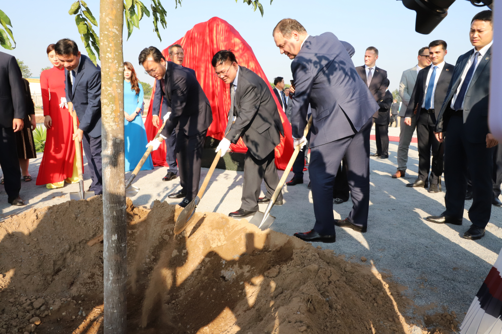 Thủ tướng Cộng hòa Belarus Roman Golovchenko và các đồng chí lãnh đạo tỉnh trồng “Hàng cây hữu nghị Belarus – Việt Nam” tại khuôn viên Công ty cổ phần xuất, nhập khẩu và chế biến thực phẩm Âu Việt (xã Chính Nghĩa, Kim Động)