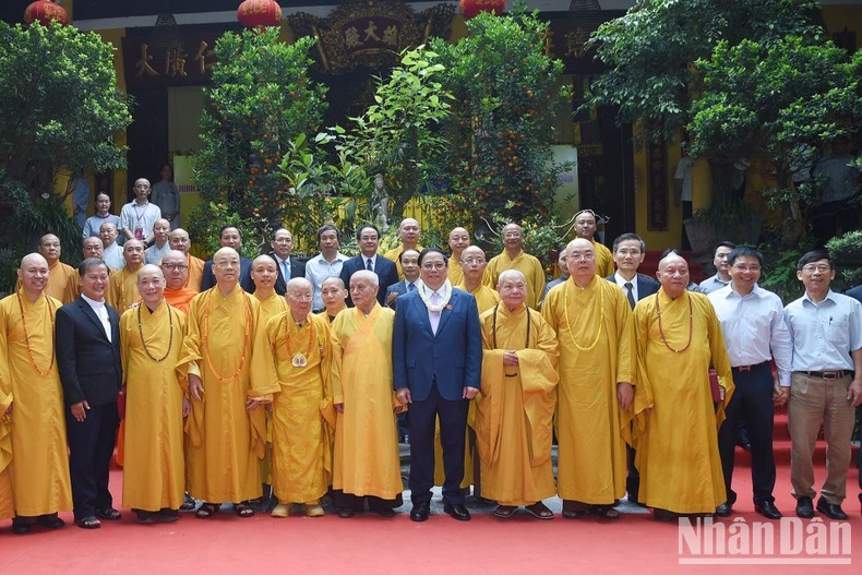 Thủ tướng Phạm Minh Chính chụp ảnh lưu niệm với Lãnh đạo Trung ương Giáo hội Phật giáo Việt Nam.