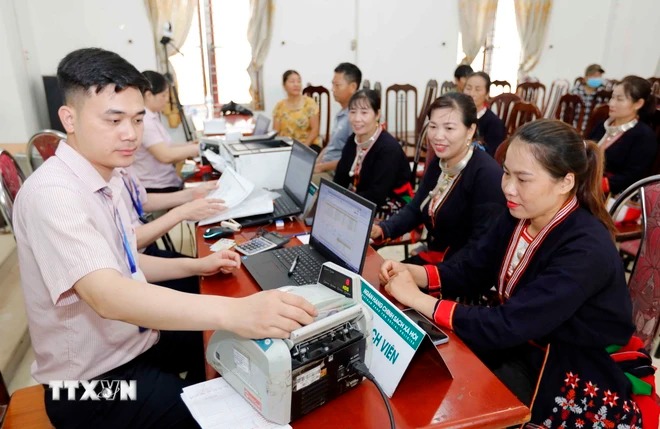Hoạt động giao dịch tại phòng giao dịch ngân hàng chính sách xã hội huyện Chợ Lách, Bến Tre. (Ảnh: Chương Đài/TTXVN)