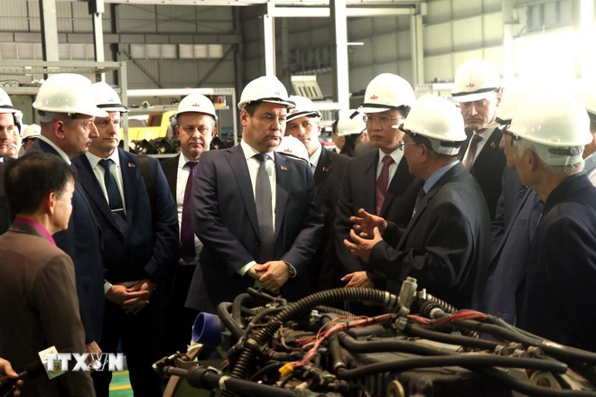 Thủ tướng Cộng hòa Belarus Roman Golovchenko tham quan Công ty Cổ phần Maz Asia, tại huyện Kim Động, tỉnh Hưng Yên chiều 7/12/2023. (Ảnh: Đinh Văn Nhiều/TTXVN)