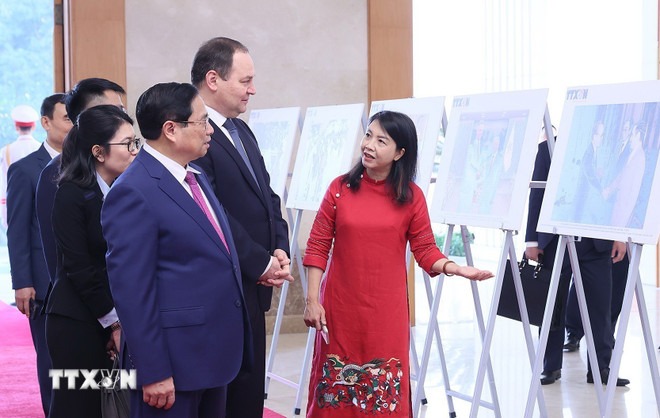 Thủ tướng Phạm Minh Chính và Thủ tướng Cộng hòa Belarus Roman Golovchenko tham quan trưng bày ảnh về quan hệ, hợp tác giữa Việt Nam- Belarus do Thông tấn xã Việt Nam thực hiện sáng 8/12/2023, tại Hà Nội. (Ảnh: Dương Giang/TTXVN)