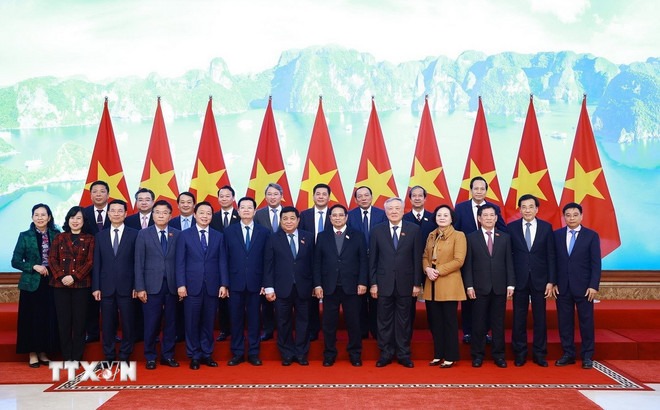 Thủ tướng Phạm Minh Chính với các thành viên Chính phủ. (Ảnh: Dương Giang/TTXVN)