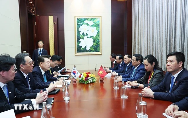 Thủ tướng Phạm Minh Chính gặp Tổng thống Hàn Quốc Yoon Suk Yeol. (Ảnh: Dương Giang/TTXVN)