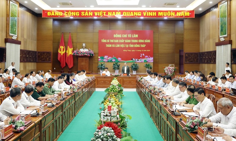 Sáng 11/12/2024, tại thành phố Cao Lãnh, Tổng Bí thư Tô Lâm và đoàn công tác Trung ương làm việc với Ban Chấp hành Đảng bộ tỉnh Đồng Tháp về tình hình thực hiện Nghị quyết Đại hội XIII của Đảng, Nghị quyết Đại hội Đảng bộ tỉnh lần thứ XI; việc thực hiện Chỉ thị số 35 của Bộ Chính trị về đại hội đảng bộ các cấp tiến tới Đại hội XIV của Đảng. (Ảnh: Thống Nhất/TTXVN)