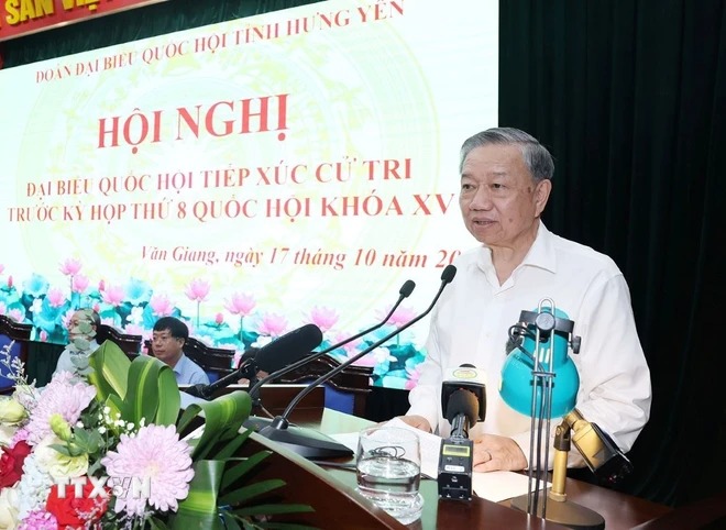 Chuẩn bị Kỳ họp thứ 8, Quốc hội khóa XV, chiều 17/10, Tổng Bí thư, Chủ tịch nước Tô Lâm cùng các thành viên Đoàn đại biểu Quốc hội tỉnh Hưng Yên đã tiến hành tiếp xúc cử tri tại huyện Văn Giang.