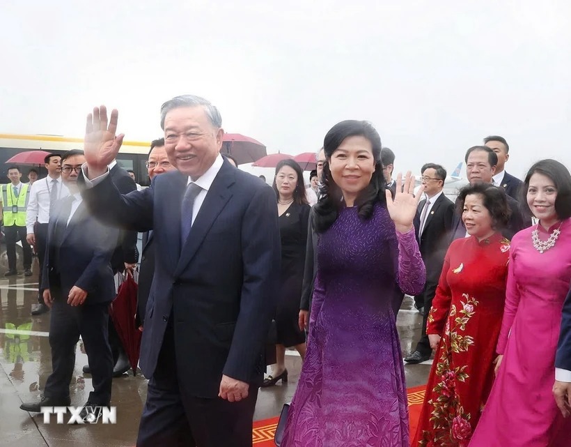 Tổng Bí thư, Chủ tịch nước Tô Lâm và Phu nhân đến Sân bay Quốc tế Bạch Vân, thành phố Quảng Châu, tỉnh Quảng Đông, Trung Quốc. (Ảnh: Trí Dũng/TTXVN)