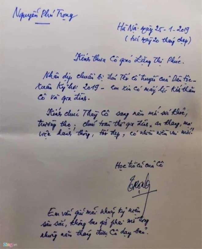 Không chỉ là một nhà lý luận xuất sắc của Đảng, nhà lãnh đạo kiệt xuất của dân tộc, Tổng Bí thư Nguyễn Phú Trọng còn là tấm gương lớn về tinh thần tôn sư trọng đạo khi dù bận trăm công nghìn việc vẫn viết thư tay thăm hỏi, chúc mừng cô giáo cũ mỗi dịp lễ, Tết hay dành thời gian về thăm trường cũ.