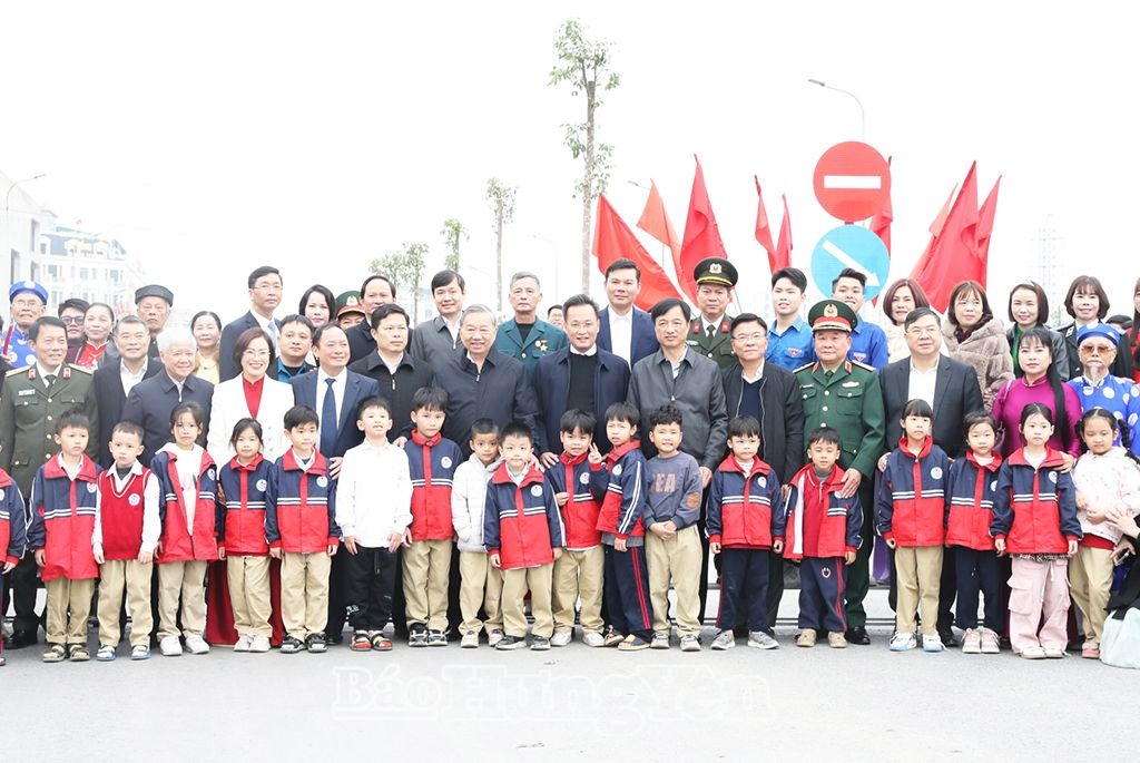 Tổng Bí thư Tô Lâm cùng các đại biểu, các tầng lớp Nhân dân thị xã Mỹ Hào chụp ảnh lưu niệm tại Lễ phát động "Tết trồng cây đời đời nhớ ơn Bác Hồ” Xuân Ất Tỵ năm 2025