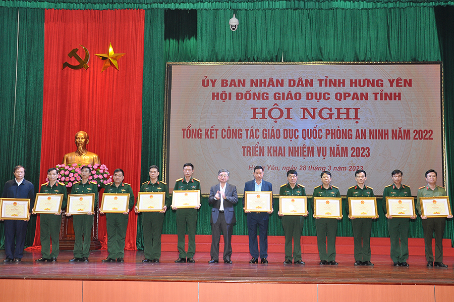Phó Chủ tịch UBND tỉnh Nguyễn Duy Hưng trao Bằng khen của Chủ tịch UBND tỉnh tặng các tập thể, cá nhân có thành tích xuất sắc trong công tác GDQP và AN năm 2022