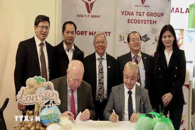 Ký kết bản ghi nhớ giữa Công ty Trách nhiệm Hữu hạn Vina T&T với Công ty Golden Gate Bce B.V (Hà Lan) về hợp tác phân phối và tiêu thụ sản phẩm trái cây và rau củ của Việt Nam. (Ảnh: Phương Hoa/TTXVN)