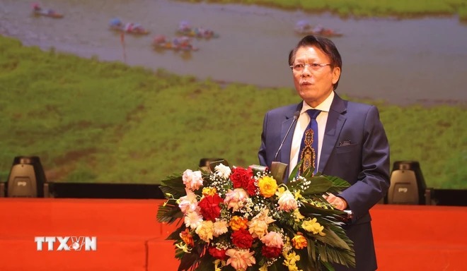 Nhạc sỹ Nguyễn Quốc Vinh, Chủ tịch Hội đồng nghệ thuật phát biểu tại Liên hoan. (Ảnh: Hải Yến/TTXVN)