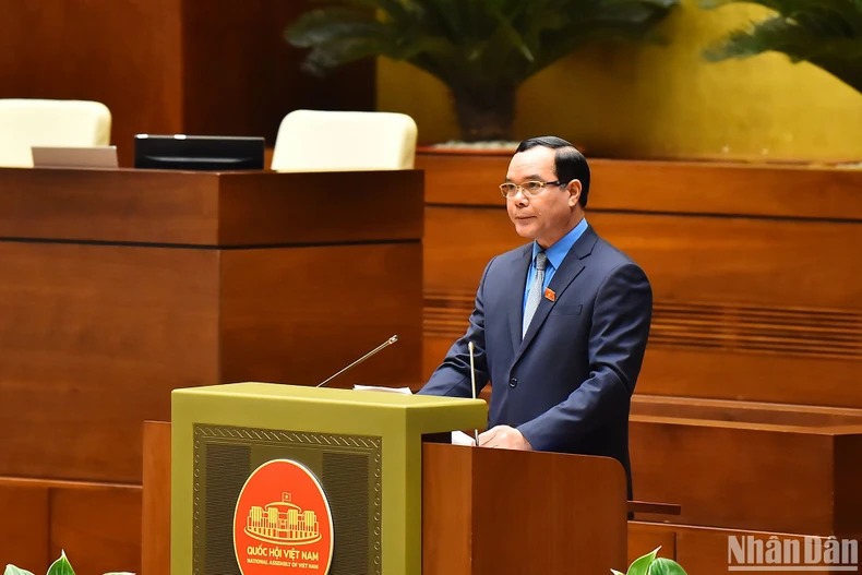 Chủ tịch Tổng Liên đoàn Lao động Việt Nam Nguyễn Đình Khang trình bày tờ trình về dự án Luật Công đoàn (sửa đổi). (Ảnh: THỦY NGUYÊN)