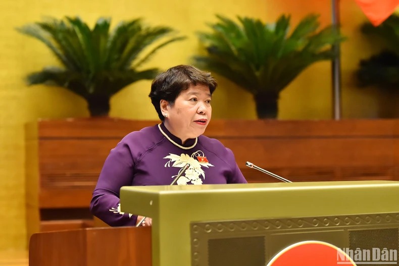Chủ nhiệm Ủy ban Xã hội Nguyễn Thúy Anh trình bày báo cáo thẩm tra về dự án Luật Công đoàn (sửa đổi). (Ảnh: THỦY NGUYÊN)