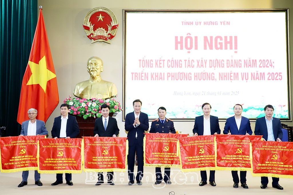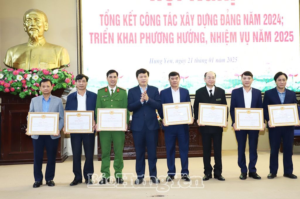 Tại hội nghị, đồng chí Bí thư Tỉnh ủy Nguyễn Hữu Nghĩa trao Bằng khen của Ban Thường vụ Tỉnh ủy tặng 3 Đảng bộ cấp trên cơ sở đạt tiêu chuẩn “Hoàn thành xuất sắc nhiệm vụ” tiêu biểu năm 2024; trao Cờ của Ban Thường vụ Tỉnh ủy tặng 9 tổ chức cơ sở đảng đạt tiêu chuẩn “Hoàn thành xuất sắc nhiệm vụ” tiêu biểu 5 năm liền (2020 - 2024). Đồng chí Trần Quốc Toản, Phó Bí thư Thường trực Tỉnh ủy, Chủ tịch HĐND tỉnh trao Bằng khen của Ban Thường vụ Tỉnh uỷ tặng 8 tổ chức cơ sở đảng đạt tiêu chuẩn “Hoàn thành xuất sắc nhiệm vụ” tiêu biểu 5 năm liền (2020 - 2024). Đồng chí Trần Quốc Văn, Phó Bí thư Tỉnh ủy, Chủ tịch UBND tỉnh trao Bằng khen của Ban Thường vụ Tỉnh uỷ tặng 9 chi bộ trực thuộc đảng ủy cơ sở đạt tiêu chuẩn “Hoàn thành xuất sắc nhiệm vụ” tiêu biểu 5 năm liền (2020-2024).