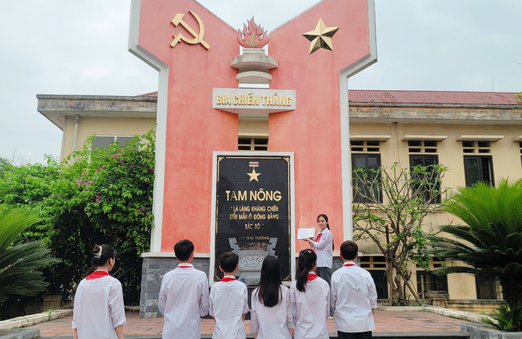 Em Lương Tú Anh cùng các bạn ôn truyền thống bên tấm bia chiến thắng tại thôn Tam Nông, xã Hưng Đạo (Tiên Lữ)