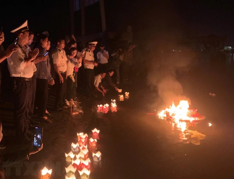 Các cựu chiến binh, thân nhân các Liệt sỹ Gạc Ma thả đèn, vòng hoa tưởng nhớ các Liệt sỹ. (Ảnh: TTXVN phát)