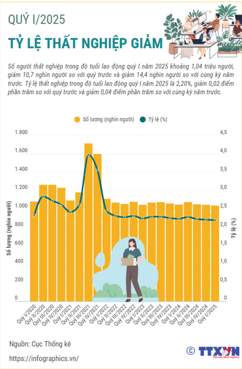 Số người thất nghiệp trong độ tuổi lao động quý 1 năm 2025 khoảng 1,04 triệu người, giảm 10.700 người so với quý trước và giảm 14.400 người so với cùng kỳ năm trước.