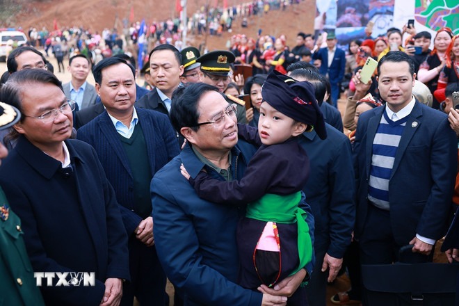 Thủ tướng Phạm Minh Chính thăm đồng bào tại dự án tái thiết thôn Làng Nủ, xã Phúc Khánh, huyện Bảo Yên. (Ảnh: Dương Giang/TTXVN)