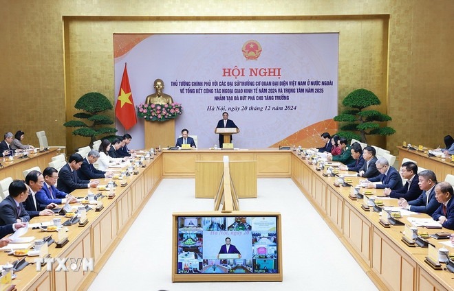 Thủ tướng chủ trì Hội nghị triển khai nhiệm ngoại giao kinh tế năm 2025 tại điểm cầu Hà Nội. (Ảnh: Dương Giang/TTXVN)
