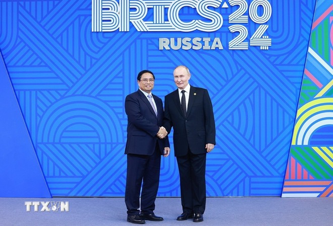 Tổng thống Liên bang Nga Vladimir Putin, Chủ tịch Nhóm BRICS năm 2024 đón Thủ tướng Phạm Minh Chính. (Ảnh: Dương Giang/TTXVN)