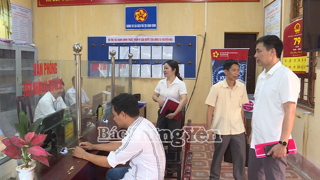 Các đồng chí trong Ban Trù bị xã tham quan vận hành Trung tâm Phục vụ hành chính công của xã Tống Trân