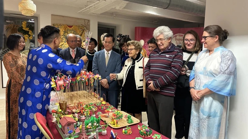 Giới thiệu về nặn tò he với bạn bè quốc tế tại Pháp. (Ảnh: Nguyễn Ngọc Hiệp/TTXVN)
