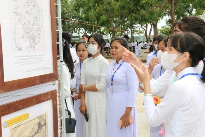 Học sinh trường THPT Lương Thế Vinh, huyện Hàm Thuận Nam, tỉnh Bình Thuận tìm hiểu về lịch sử, chủ quyền của Việt Nam qua Triển lãm bản đồ "Hoàng Sa, Trường Sa của Việt Nam - Những bằng chứng lịch sử và pháp lý". (Ảnh: Nguyễn Thanh/TTXVN)