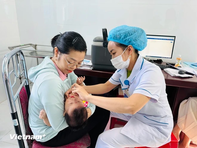 Nhân viên y tế cho trẻ uống Vitamin tại Trạm Y tế xã Cam Tuyền, huyện Cam Lộ, tỉnh Quảng Trị. (Ảnh: T.G/Vietnam+)