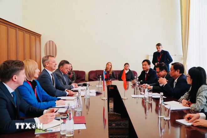 Hội đàm với Phó Chủ tịch thứ nhất Hội đồng Liên bang Quốc hội Liên bang Nga, Chủ tịch Nhóm Nghị sỹ hữu nghị hợp tác với Việt Nam của Hội đồng Liên bang Andrey Yatskin. (Ảnh: Tâm Hằng/TTXVN)