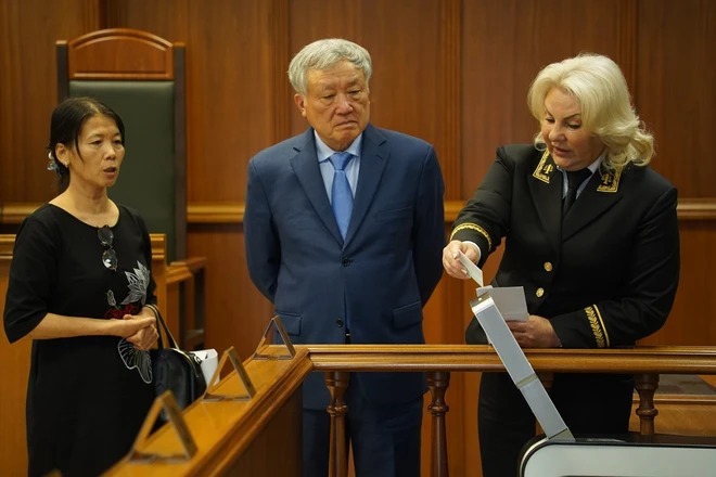 Chánh án Nguyễn Hòa Bình khảo sát phủ tục xét xử tại Tòa án thành phố Moskva. (Ảnh: Duy Trinh/TTXVN)