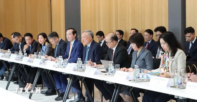 Phó Thủ tướng Thường trực Chính phủ Nguyễn Hòa Bình trao đổi với Tổ chức Luxembourg for Finance (LFF). (Ảnh: Hương Giang/TTXVN)