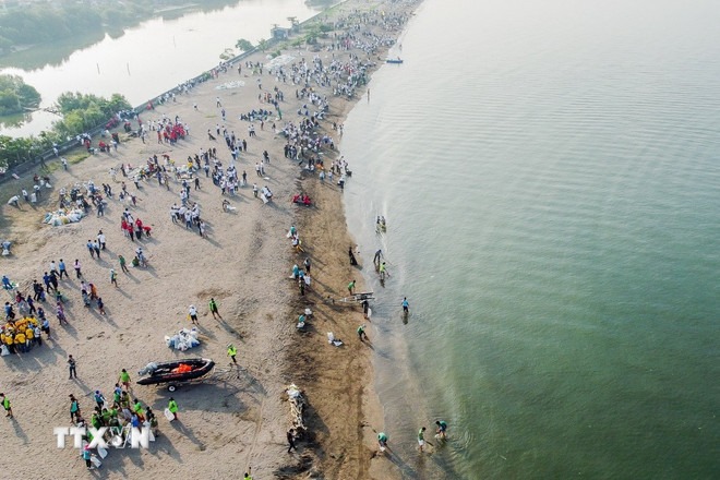 Tình nguyện viên dọn rác trên bờ biển ở Vịnh Manila (Philippines). (Ảnh minh họa: THX/TTXVN)