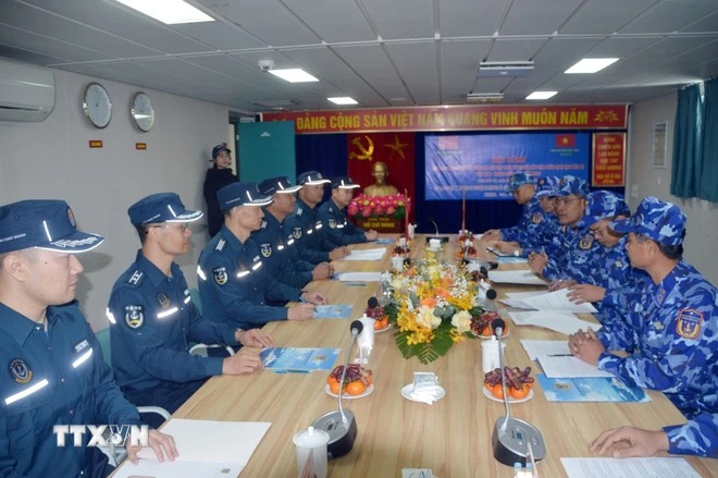 Lực lượng tuần tra của Cảnh sát biển Việt Nam - Trung Quốc hội đàm trên tàu CSB 8004. (Ảnh: TTXVN phát)
