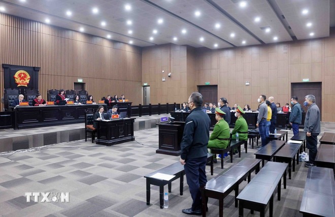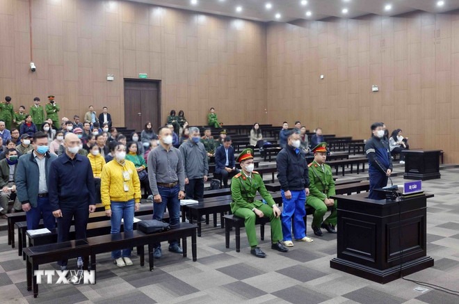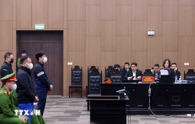 Các bị cáo tại phiên tòa xét xử. (Ảnh: Phạm Kiên/TTXVN)