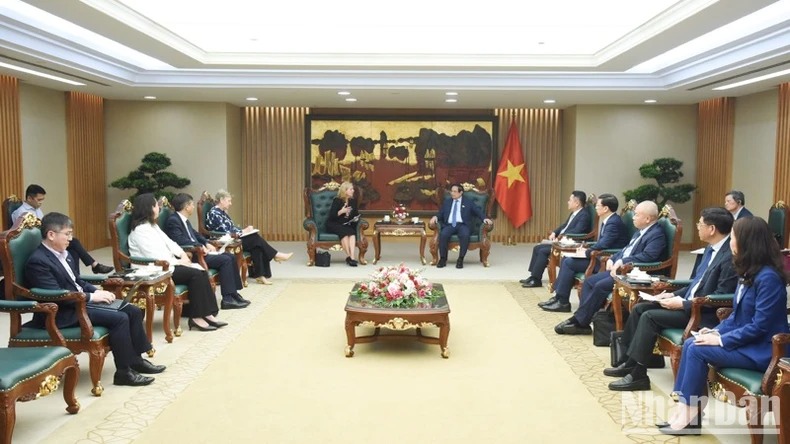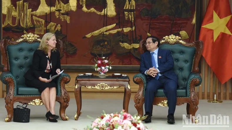 Thủ tướng Phạm Minh Chính và bà Mariam J. Sherman, Giám đốc Quốc gia của Văn phòng Ngân hàng Thế giới (WB) khu vực Việt Nam, Lào, Campuchia. (Ảnh: TRẦN HẢI)