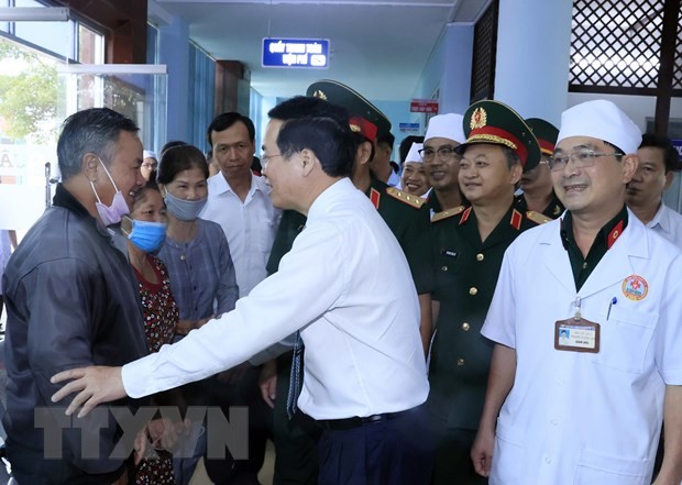 Chủ tịch nước Võ Văn Thưởng thăm hỏi nhân dân đến khám chữa bệnh tại Bệnh viện Quân y 15. (Ảnh: Thống Nhất/TTXVN)