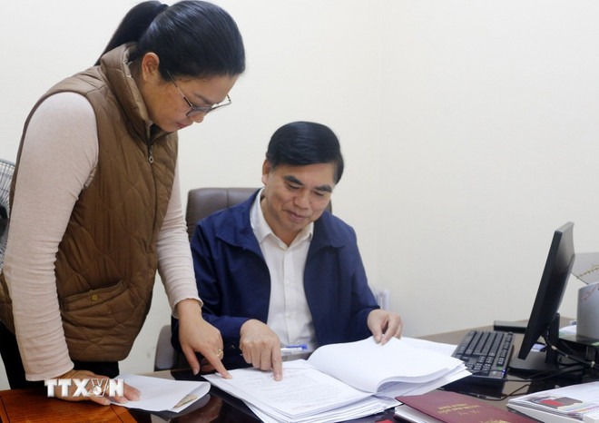 Ông Ngô Quang Hùng, Phó trưởng Ban Tuyên giáo và Dân vận Huyện ủy Nam Đàn (Nghệ An) xin nghỉ trước tuổi hưu dù còn gần chín năm công tác và đề xuất tặng bằng khen cho những người tiên phong xin nghỉ trước tuổi hưu để động viên, khuyến khích. (Ảnh: Bích Huệ/TTXVN)
