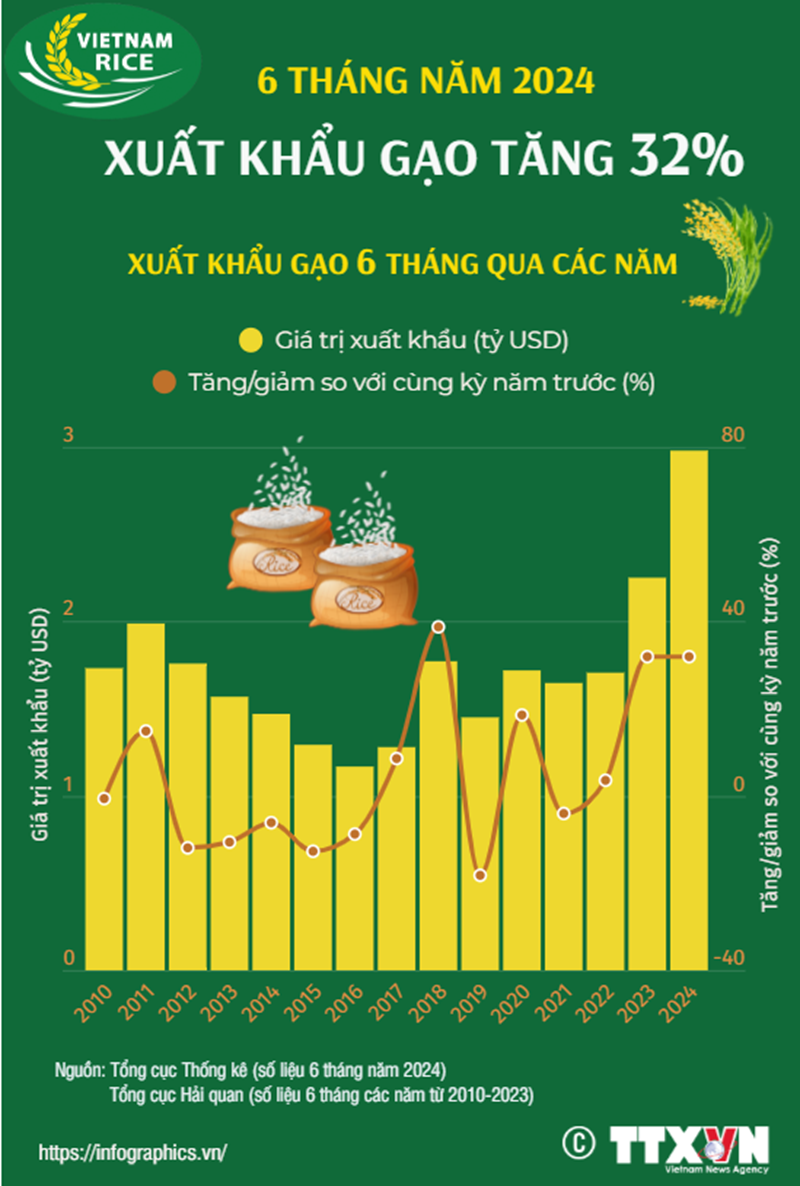Theo Tổng cục Thống kê, xuất khẩu gạo trong 6 tháng năm 2024 của cả nước ước đạt 4,68 triệu tấn với kim ngạch đạt 2,98 tỷ USD, tăng 10,4% về lượng và 32% về giá trị so với cùng kỳ năm 2023.