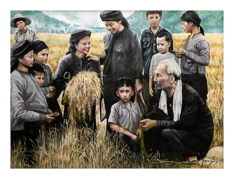 Một tác phẩm được trưng bày tại triển lãm “Tấm lòng của họa sĩ Việt kiều với Bác Hồ”. Ảnh: Bảo tàng Mỹ thuật Việt Nam cung cấp.