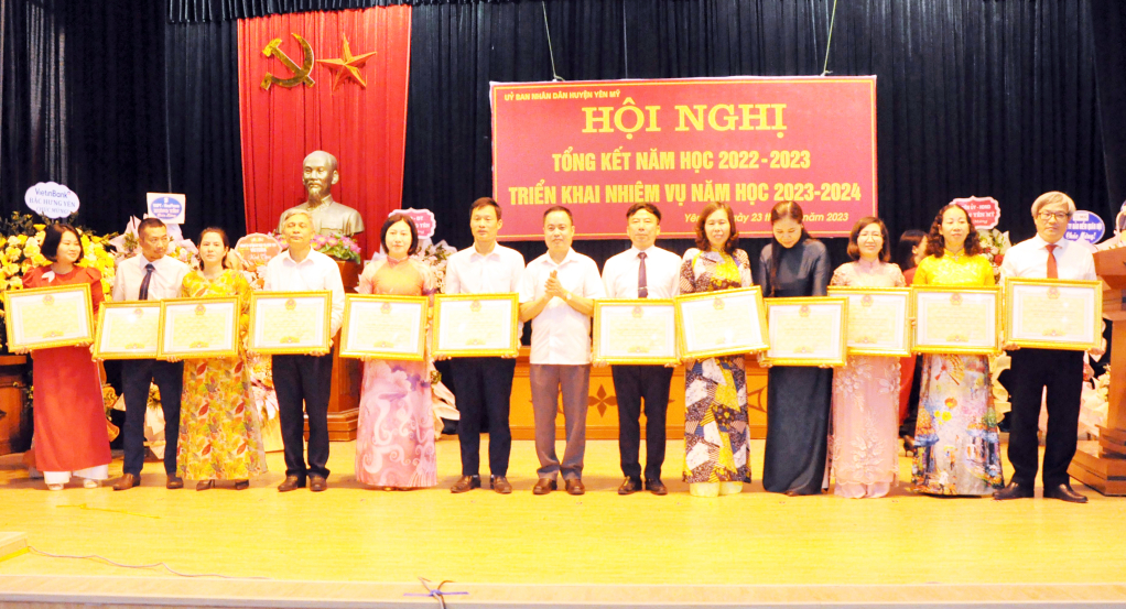 Lãnh đạo UBND huyện Yên Mỹ trao Bằng khen của Chủ tịch UBND tỉnh tặng các tập thể, cá nhân có thành tích xuất sắc trong năm học 2022-2023