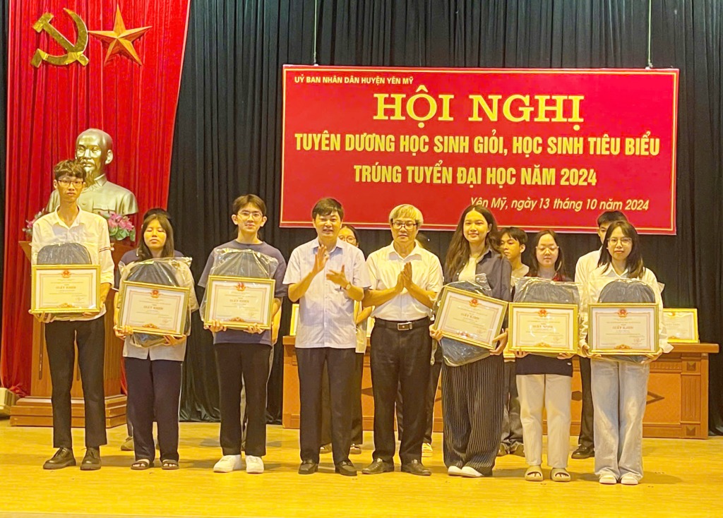 Tại hội nghị, huyện Yên Mỹ đã tuyên dương, khen thưởng các học sinh đạt giải trong các kỳ thi chọn học sinh giỏi cấp tỉnh, cấp huyện; học sinh tiêu biểu trúng tuyển đại học năm 2024.